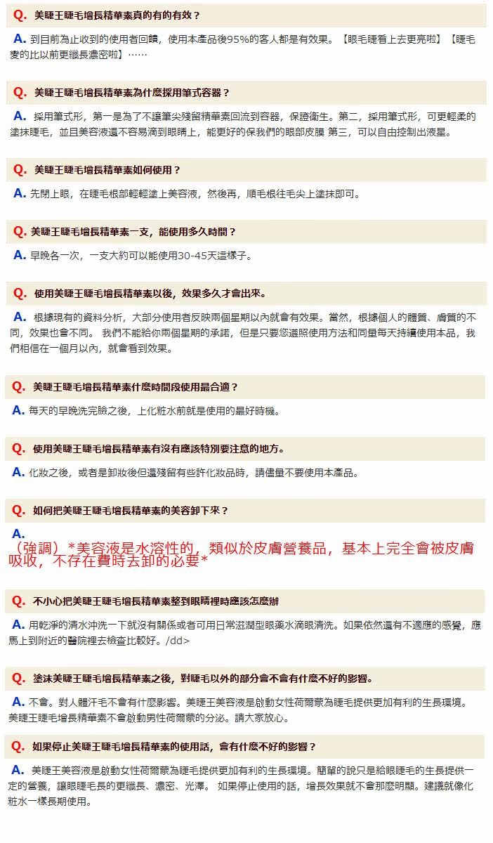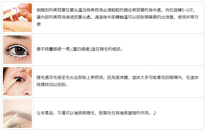 美睫王睫毛增长精华素完全针对亚洲人的皮肤及毛发进行研究开发,相对於一些其它欧美国家的產品来说,对皮肤的刺激性少。无副作用,特别适合亚洲人。即使是敏感性皮肤的客人也可以放心的使用本產品。
